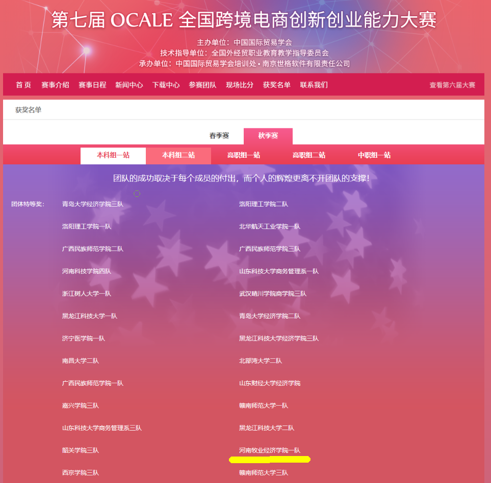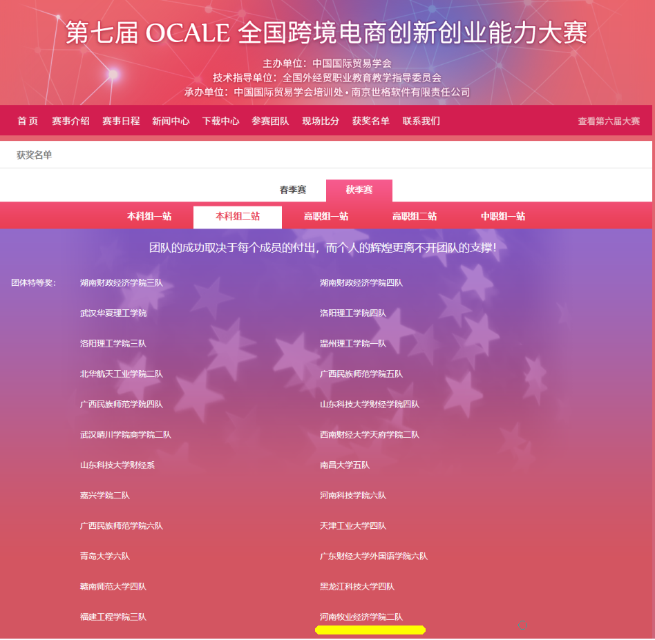2021年11月17日,第七届OCALE全国跨境电商创新创业能力大赛落下帷幕。由太阳成集团tyc33455cc老师指导国际经济与贸易本科班员工组建的三个团队参加本科组比赛,经过艰苦、科学系统的培训演练及3天12个回合的激烈角逐,所有团队均喜获全国团体佳绩,分别为两个特等奖项、一个一等奖项,这是公司参加该赛项的最好成绩,成绩的取得充分彰显了公司国际经济与贸易专业跨境电商方向的办学实力。
