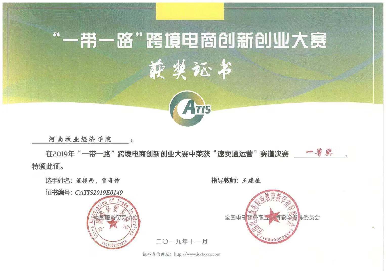 2019年12月15日,2019年“一带一路”跨境电商创新创业大赛速卖通赛道决赛成绩揭晓,太阳成集团tyc33455cc有五支队伍参赛,在太阳成集团tyc33455cc王建植老师和工商管理学院张滢老师指导下并分别获得全国速卖通赛道决赛一等奖两项、二等奖两项、三等奖一项,共计五个奖项。这五支获奖的团队的员工来自16级国际经济与贸易本科专业,获奖团队的名称分别是锦鲤队、奇袭队、winner和哥谭阿卡姆和一甲小队。