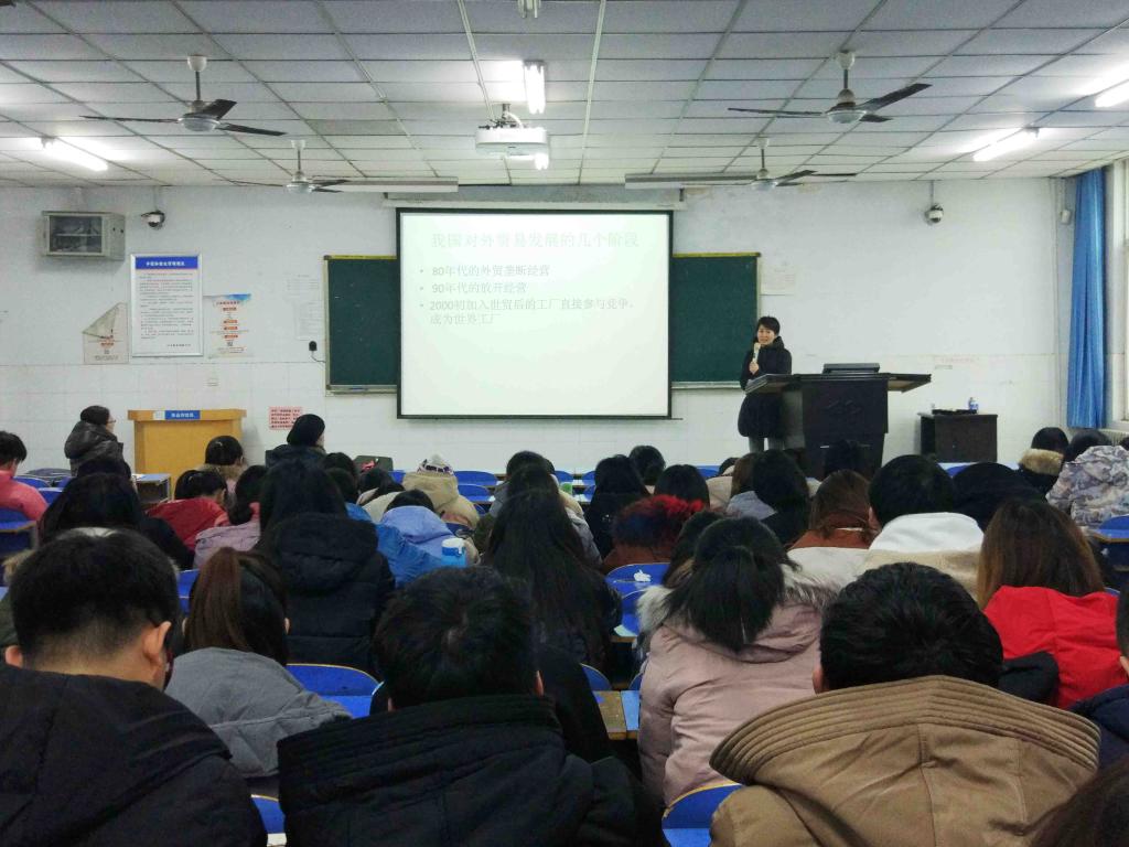 2017年12月14日下午,由经济贸易学院主办的“当前外贸出口的现状和趋势”专题讲座在E楼203室举行。本次讲座邀请河南省新美豪进出口有限公司部门经理徐晓华女士为主讲人,为国际经济与贸易专业的员工讲解了当前河南一般贸易模式下出口贸易的现状和发展趋势。
