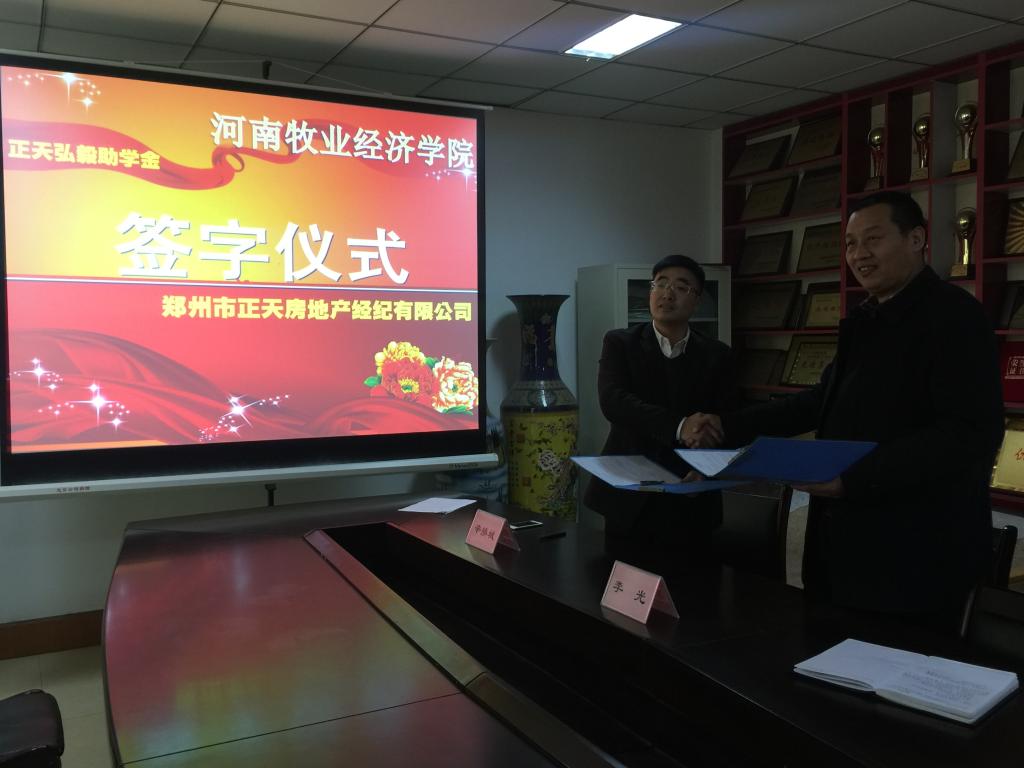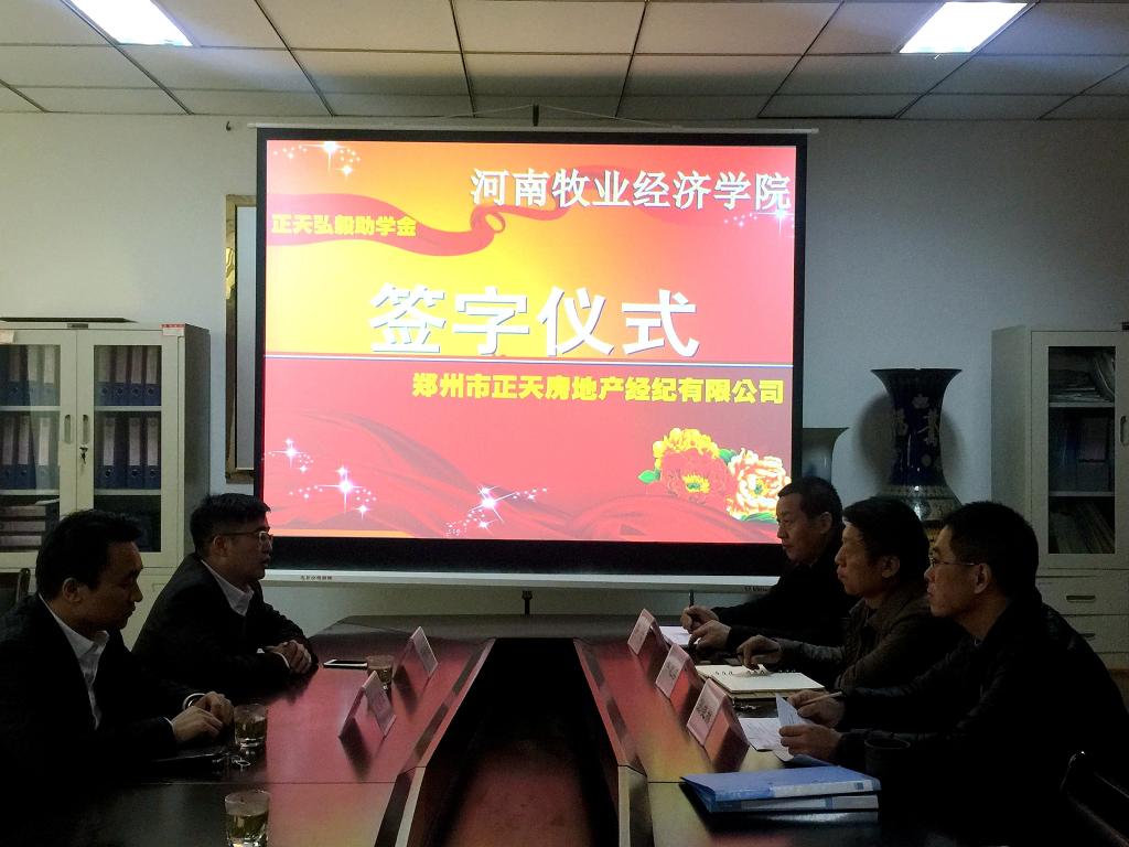 2016年12月2日上午十时,在太阳成集团tyc33455ccwww经济贸易学院会议室,经贸学院和郑州市正天房地产经纪有限公司签订捐资助学协议,签字仪式的参加人员有经贸学院的李光经理、牛建绥书记、孙晓林副经理、正天公司总经理辛换城先生和后勤总经理周拥军先生。会议由孙晓林副经理主持。