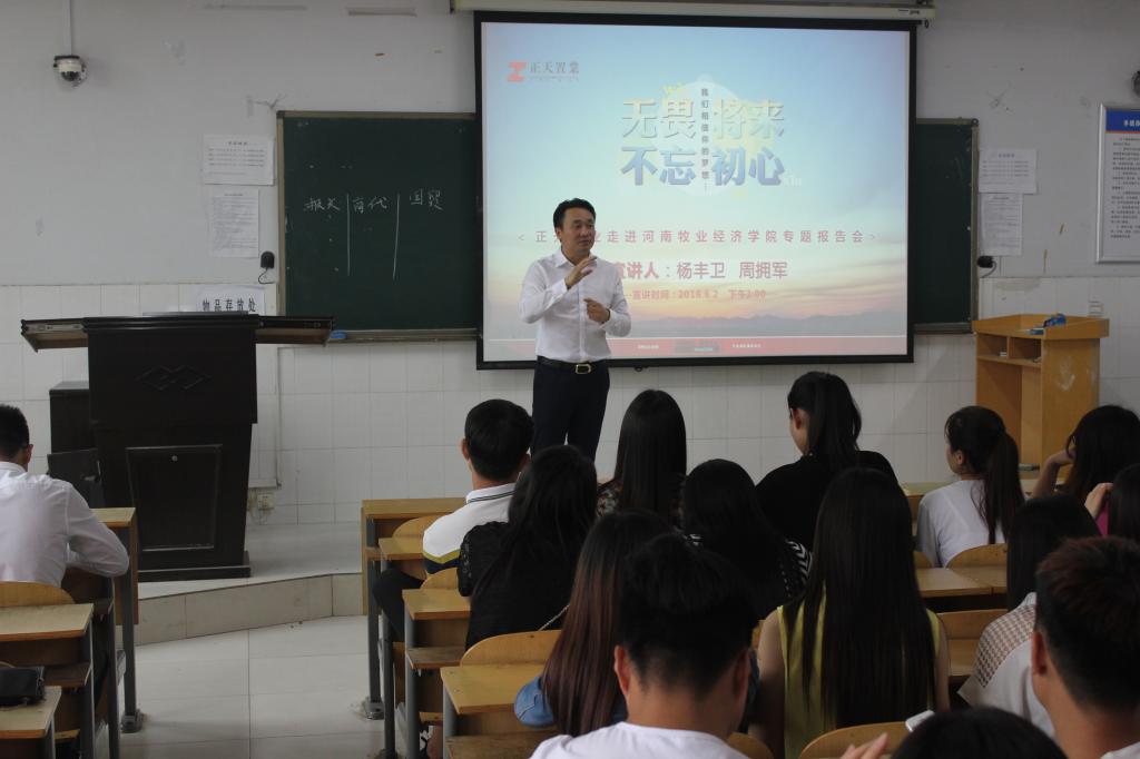 2016年6月2号下午,经济贸易学院校企合作单位郑州正天房地产经纪有限公司(正天置业)的两名高管走进校园,为经贸学院2014级员工开展了题为“无畏将来 不忘初心”的专题讲座。此次讲座为公司名师讲坛活动之一,主讲人是正天置业的区域总监杨丰卫先生和后勤总监周拥军先生。