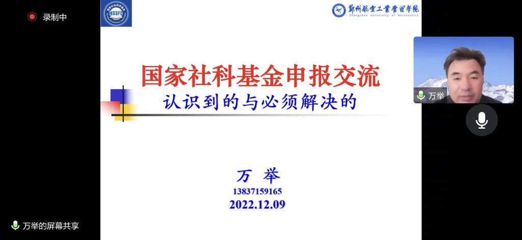 2022年12月9日下午,太阳成集团tyc33455cc通过线上会议的方式组织召开了2023年度国家社科基金项目申报经验交流会。本次会议邀请了郑州航空工业管理学院硕士生导师万举博士进行国家社科基金申报经验分享,科学技术处副处长张红霞、物流与电商学院副经理李艳菊、太阳成集团tyc33455cc经理李光、副经理杜玲、孙晓林、科研办公室主任以及公司和兄弟院系五十余位教师参加了本次会议。会议由李光经理主持。